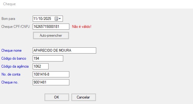 - Clique o botão Auto-preencher. O programa tentará encontrar cheques ou clientes com este CPF ou CNPJ no sistema.