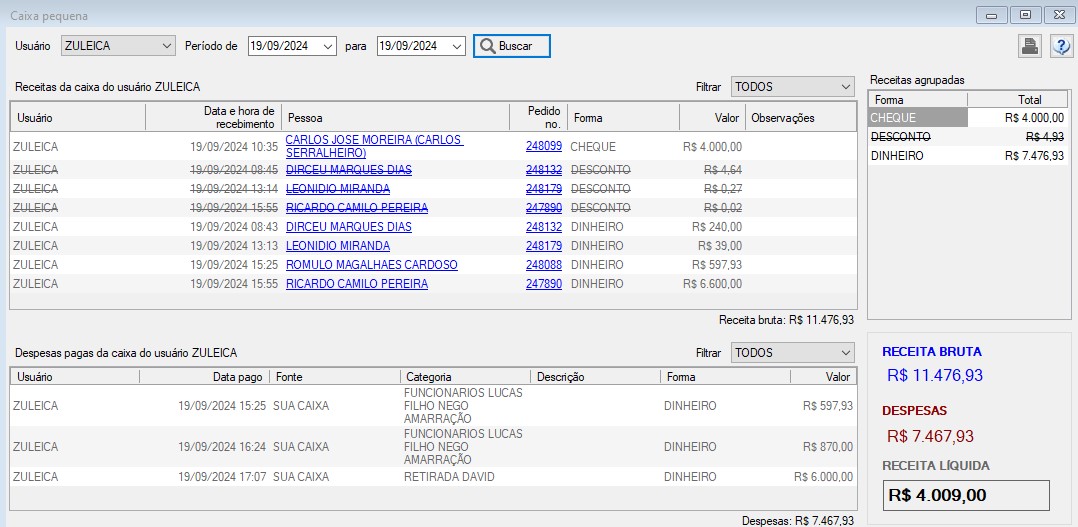 Cada usuário do sistema (ou pelo menos todos os atendentes de frente de loja) deve operar uma caixa pequena própria. A caixa pequena mostra a movimentação de dinheiro e o saldo das receitas e despesas pagas no período desejado.