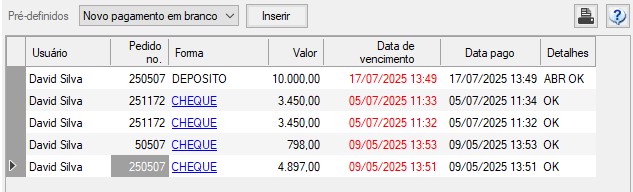| Pedido no. | Forma | Valor | Data pago | Detalhes |