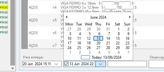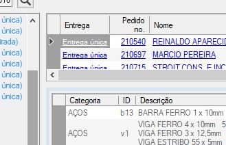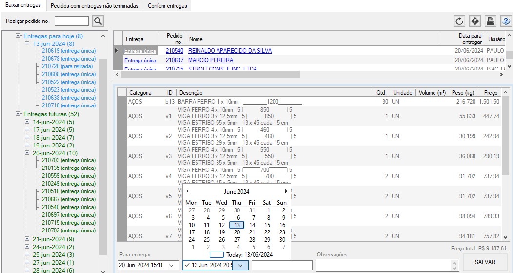 Ao selecionar uma entrega, os itens dessa entrega serão apresentadas na tabela inferior. O sofie calcula pesos de AÇOS e volumes e pesos de MADEIRAS presentes na entrega, para que você possa melhor planejar o transporte de materiais e evitar o sobrecarregamento do veículo.