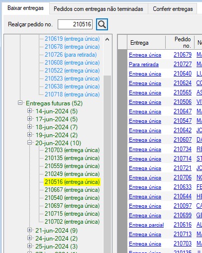 Se tiver muitas entregas na lista, uma entrega pode ficar escondida dentro da hierarquia. Use o campo Realçar pedido no. para achar entregas relacionadas a um pedido específico.