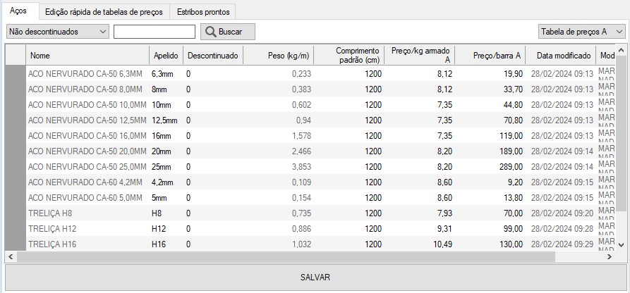 A tela Lista de aços serve para editar os precos de venda de AÇOS.