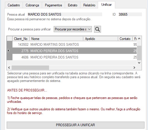 O cadastro que foi unificado será apagado do sistema na conclusão do processo.